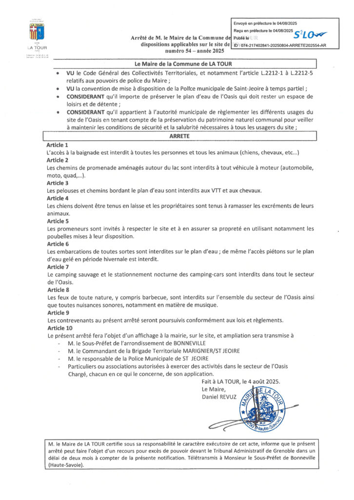 Arrêté n° 54 dispositions applicables sur le site de l’Oasis Publié par admin9880 le 17 mars 2026 dans La Commune La Commune