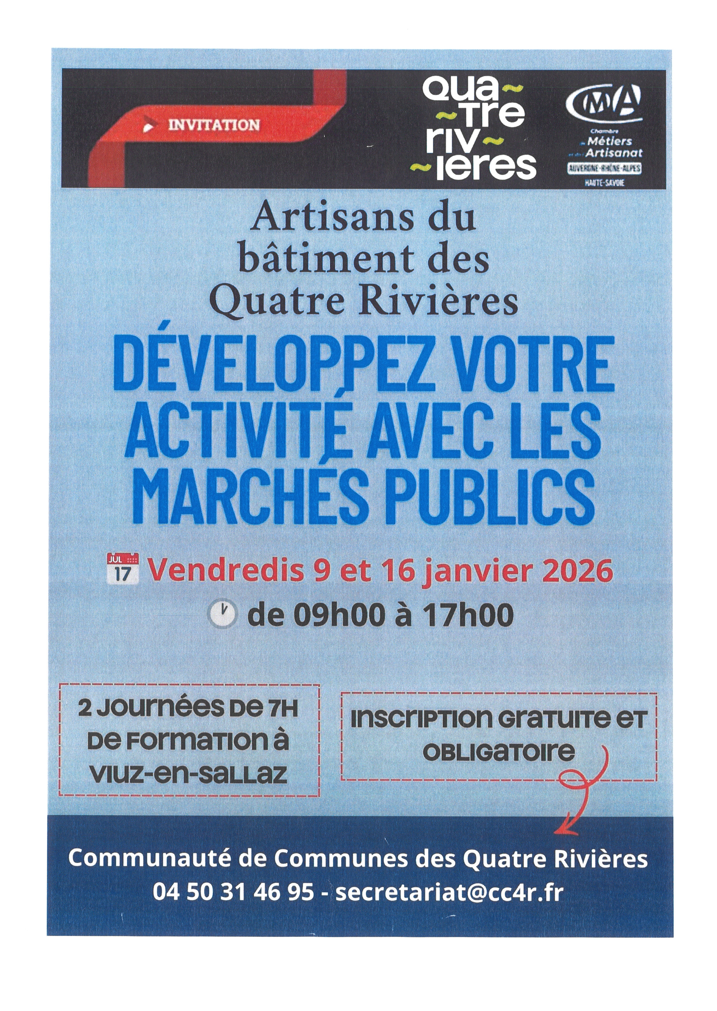 Artisans du bâtiment des Quatre Rivières développez votre activité avec les marchés publics + Ajouter à mon Agenda Google + iCal / Outlook export L'événement est terminé. Date Jan 09 - 16 2026 Expired! Partagez cet événement