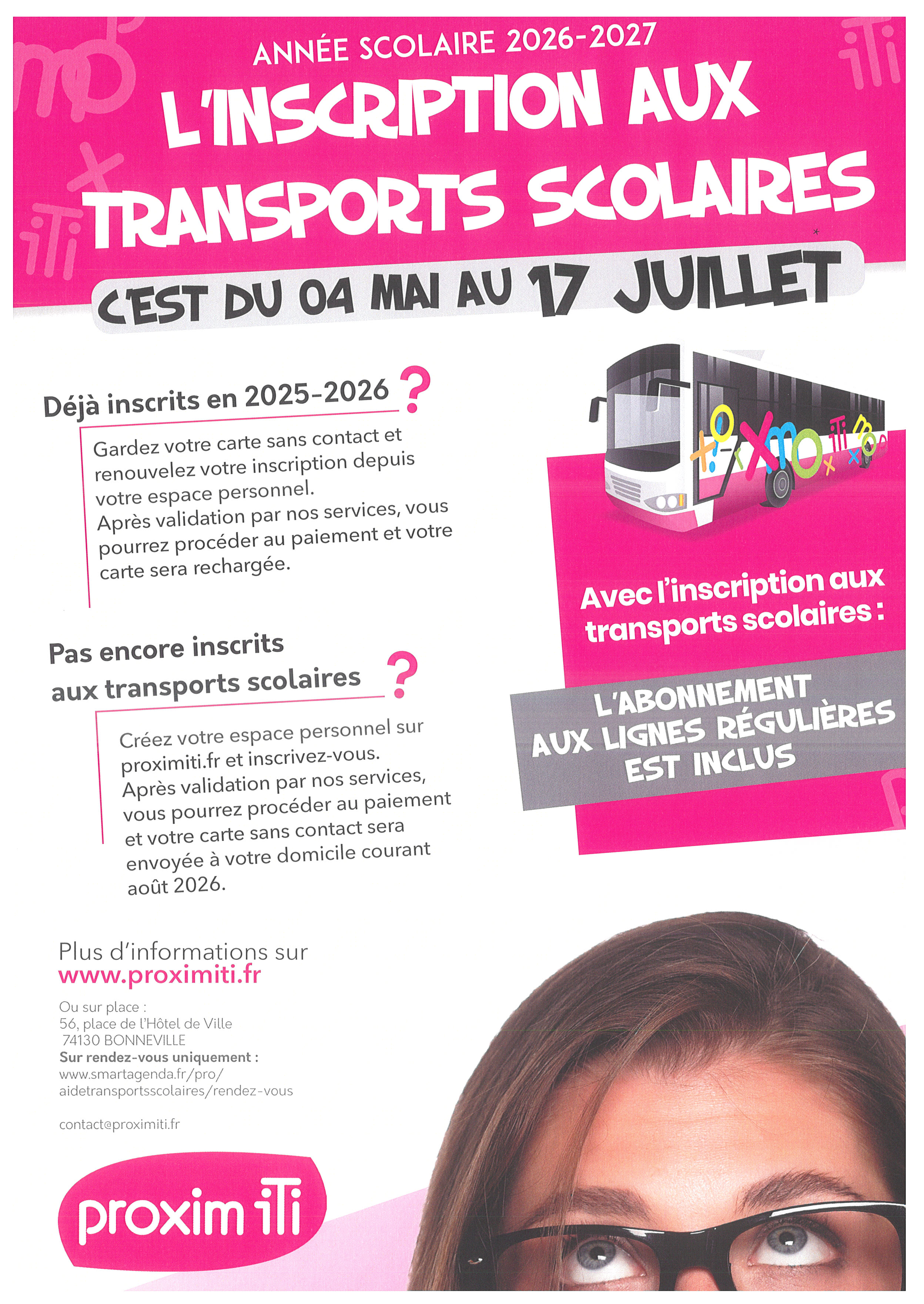 ou sur place : 56, place de l’Hôtel de Ville 74130 BONNEVILLE – sur rendez-vous uniquement : www.smartagenda.fr/pro/aidetransportsscolaires/rendez-vous