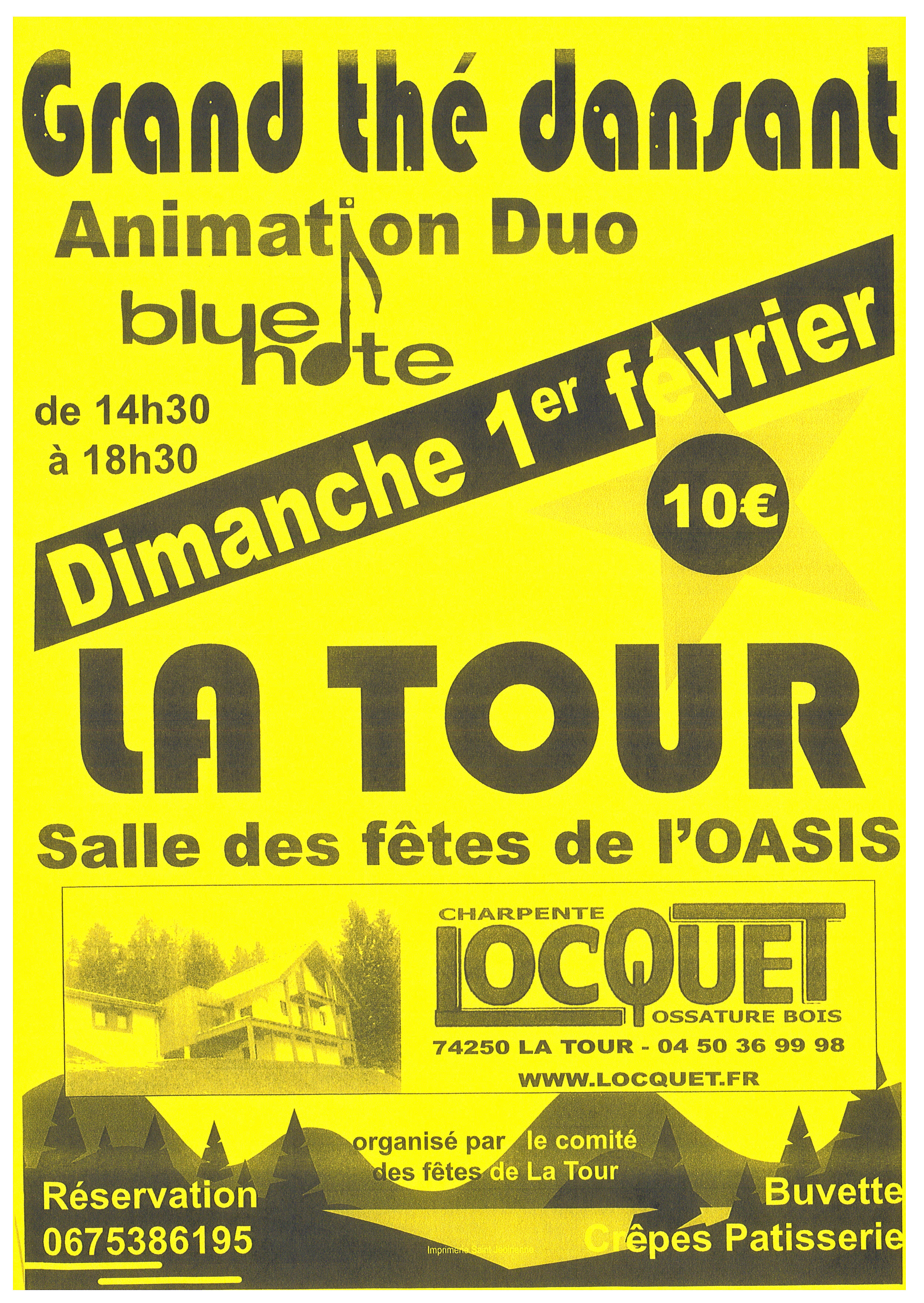 Grand thé dansant + Ajouter à mon Agenda Google + iCal / Outlook export 00 jours 00 heures 00 minutes 00 secondes Date Fév 01 2026 Heure 14 h 30 min - 18 h 30 min Tarif 10.00€ Lieu Salle de l'Oasis LA TOUR Organisateur Comité des Fêtes de La Tour Téléphone 06 75 38 61 95 Partagez cet événement